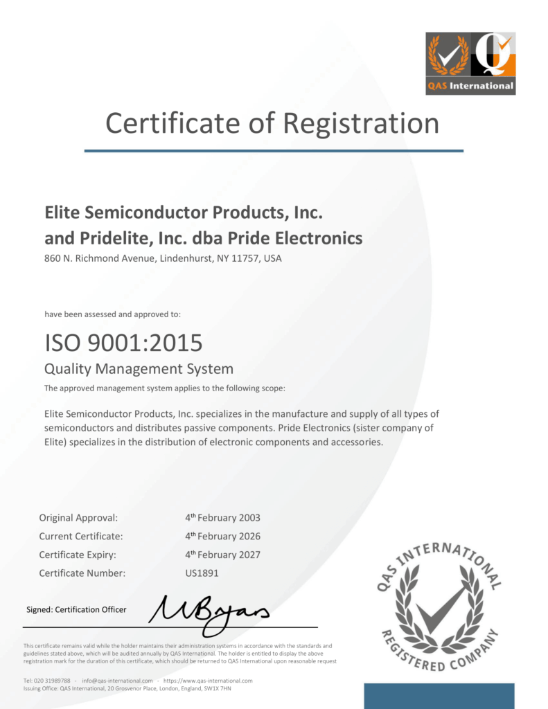 Established in 1971 ( ISO 9001:2015 CERTIFIED )Elite Semiconductor Products, Inc. is a manufacturer and distributor of quality electronic components. Elite markets its products under its own name as well as the major manufacturers found on the web sites’ part search system. We are dedicated to serving the industry with quality products at a competitive price. We are capable of doing special testing and marking from our large component inventory. Elite takes every precaution for reliability by using only “State of the art” test equipment. Our Sales and engineering departments are ready to assist you in the following capacity: SCR’s, TRIACS, rectifiers, power rectifiers, bridge rectifiers,zener diodes,schottky diodes, small signal transistors, power transistors, DIACS, and IC’s.